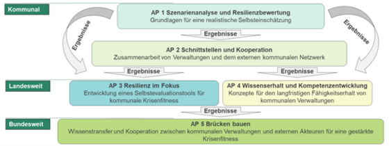 Das Vorhaben gliedert sich in fünf Arbeitspakete (AP), die inhaltlich bei den kommunalen Anforderungen und Sichtweisen ansetzen und sich hinsichtlich der betrachteten Perspektiven und der räumlichen Breite erweitern. Damit wird sichergestellt, dass die zentralen Forschungsfragen zur kommunalen Krisenfitness entlang realistischer kommunaler Bedarfe fokussiert werden sowie praktikablen Möglichkeiten zur Erhaltung und Erhöhung dieser Krisenfitness nachgegangen wird.